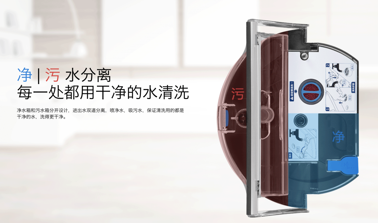 ILIFE智意W400所采用的大容量?jī)粑鬯浞蛛x設(shè)計(jì),隨時(shí)確保只用凈水洗地,極大地提升了清潔效果。