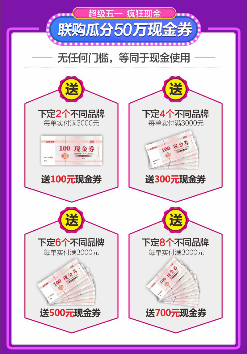 3、聯(lián)購滿額瓜分50萬現(xiàn)金券:5月1日-5月4日活動期間,顧客每單實付3000元,下定2個不同品牌,即送100元現(xiàn)金券,下定4個不同品牌,即送300元現(xiàn)金券,下定6個不同品牌,即送500元現(xiàn)金券,國安居準(zhǔn)備了50W現(xiàn)金券,送完即止。