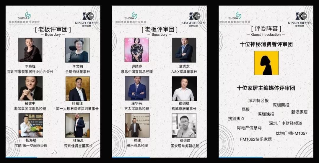 其中,由簡(jiǎn)一大理石瓷磚、海爾卡薩帝、慕思寢具、A&X家具、方太電器、構(gòu)城定制、雅樂(lè)薈、寶能第一空間、國(guó)安居、佳得寶等家居行業(yè)知名品牌老總組成的老板評(píng)審團(tuán)特別引人注目。組委會(huì)特別介紹,這些品牌在行業(yè)的影響力有目共睹,他們的認(rèn)可是對(duì)設(shè)計(jì)能力與市場(chǎng)影響力不可置疑的肯定。
