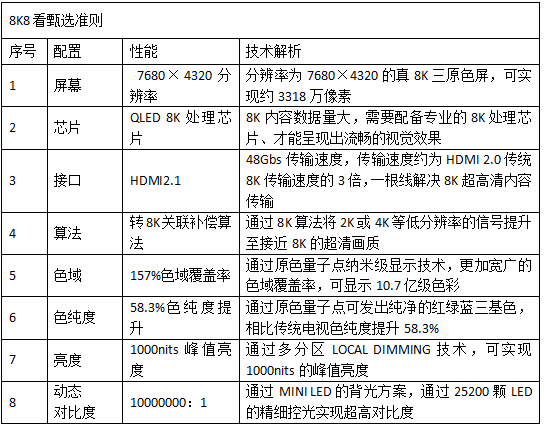 在行業(yè)趨勢及國家政策的雙重推動下,為正確引導8K電視市場發(fā)展方向、加快發(fā)展步伐,TCL聯(lián)合國家廣播電視產(chǎn)品質(zhì)量監(jiān)督檢驗中心經(jīng)過長時間的市場調(diào)研及總結(jié),從行業(yè)整體的角度對8K電視進行了初步探討,并編制出《8K8看甄選白皮書》。這份白皮書告訴我們,實現(xiàn)真正的8K震撼視覺體驗關鍵性能/技術(shù)要求如下。