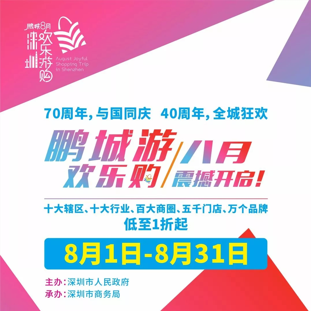 8月1,2019年“鵬城八月歡樂游購”系列促消費(fèi)活動(dòng)正式拉開帷幕,活動(dòng)以“鵬城游·歡樂購”“深圳let’s購”“深圳不限購”“樂享盛夏·歡購鵬城”等為口號(hào),整個(gè)8月將在全市營造“天天有優(yōu)惠、周周有活動(dòng)、行行促消費(fèi)、區(qū)區(qū)有特色”的氛圍。搶抓中央打造粵港澳大灣區(qū)和大力發(fā)揮消費(fèi)基礎(chǔ)性作用的雙重機(jī)遇,以激發(fā)居民消費(fèi)潛力為目的,以舉辦大型促消費(fèi)活動(dòng)為手段,以開展大規(guī)模宣傳造勢為驅(qū)動(dòng),推廣宣傳深圳制造、深圳品牌和深圳設(shè)計(jì),結(jié)合暑期消費(fèi)熱點(diǎn),發(fā)揮濱海旅游資源優(yōu)勢,吸引國內(nèi)外最具活力和消費(fèi)力的年輕人群齊聚深圳,共同享受夏日的購物狂歡盛宴。此外,以本次活動(dòng)為起點(diǎn),從2019年開始,深圳市將在每年8月作為“鵬城歡樂游購”月定期舉辦。通過3-5年的持續(xù)打造,力爭將其辦成規(guī)模最大、影響力最強(qiáng)、知名度最高的國內(nèi)一流的促消費(fèi)活動(dòng),成為深圳城市的一張靚麗名片。