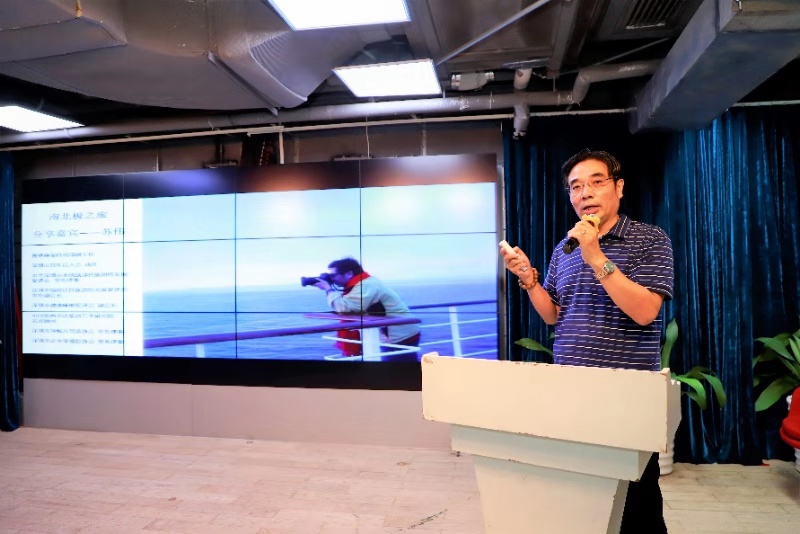 蘇偉老師在現(xiàn)場(chǎng)介紹:10月15日對(duì)深圳來(lái)說(shuō)是一個(gè)極其不平凡的日子,上午在深圳舉辦了首屆“中國(guó)海洋第一展”暨“2019中國(guó)海洋經(jīng)濟(jì)博覽會(huì)”在深圳會(huì)展中心隆重開幕,下午由中國(guó)自主建造的首艘極地科學(xué)考察破冰船“雪龍2”號(hào)在蛇口港出發(fā)首航挺進(jìn)南極,特別機(jī)緣巧合的是我今晚分享的內(nèi)容就是南北極旅游。為什么用“畫”極地,而不是“話”極地,這是因?yàn)椋厍蛴腥龢O,除了南北極外,還有“珠峰”就是第三極。而我們?nèi)齻€(gè)六十年的老男人,在蘇偉老師的鼓動(dòng)下,三個(gè)人用不到三年的時(shí)間,踏訪了這“三極”。如果要展開講,恐怕三天三夜也講不完。所以,“畫”極地,就是用照片,講一下照片背后的故事。