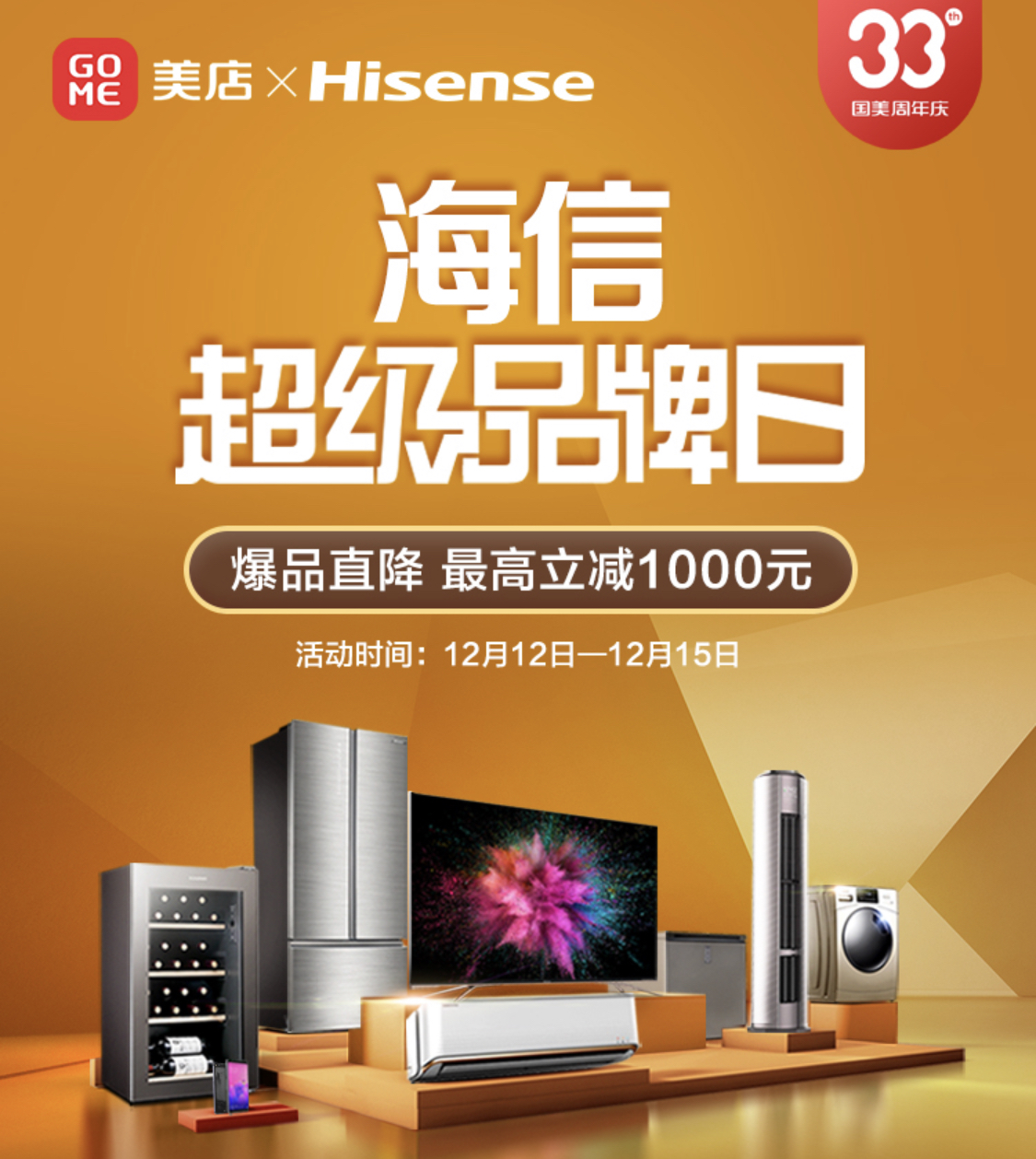 深圳新聞網(wǎng)2019年12月12日訊 12月12日-15日,國美33周年慶活動已經(jīng)啟動,屆時消費者可在深圳國美門店參與“全場好物,第二件5折起”活動。同時,海信、海爾、美的超級品牌日活動也將于12日-15日期間在國美美店展開。用戶在國美APP中美店活動專區(qū)便可參與到活動中來,下面為大家介紹下本次海信超級品牌日的重磅爆品,全場最高立減1000元,還有機會獲得愛奇藝四端VIP會員卡和小度音箱等福利獎品,不要錯過。