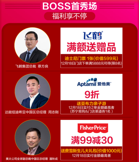 12月18日,蘇寧紅孩子打造了線上線下雙線齊發(fā)的“年終狂歡搶購盛典”。母嬰品牌大佬帶頭發(fā)福利,飛鶴集團總裁蔡方良、達能紐迪希亞中國區(qū)總經(jīng)理周志剛、美太公司全球副總裁中國區(qū)總經(jīng)理潘秋成、寶潔大中華區(qū)幫寶適副總裁任遠,金佰利大中華區(qū)董事總經(jīng)理Mike等豪送價值十萬大禮。活動當天,購相應品牌產(chǎn)品且實付金額最高者就能將戴森吹風機、老鳳祥黃金、迪士尼門票等大禮免費帶回家。