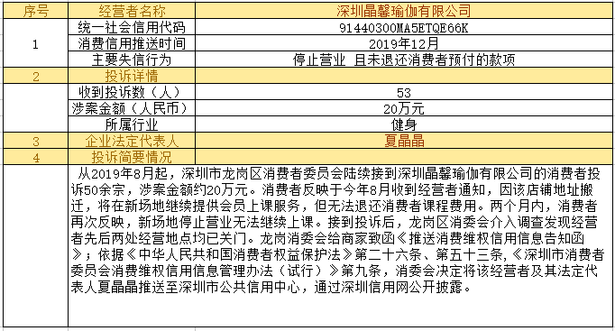 深圳新聞網(wǎng)2019年12月24日訊12月24日,為加強(qiáng)對(duì)商品和服務(wù)的社會(huì)監(jiān)督,推進(jìn)消費(fèi)領(lǐng)域信用體系建設(shè),深圳市消費(fèi)者委員會(huì)(以下簡(jiǎn)稱“深圳市消委會(huì)”)聯(lián)合福田區(qū)消費(fèi)者委員會(huì)(以下簡(jiǎn)稱“福田區(qū)消委會(huì)”)和龍崗區(qū)消費(fèi)者委員會(huì)(以下簡(jiǎn)稱“龍崗區(qū)消委會(huì)”)將深圳豬兼強(qiáng)互聯(lián)網(wǎng)科技有限公司、深圳市皇域貿(mào)易有限公司、深圳市百家順資產(chǎn)管理有限公司、深圳市予恩美容美發(fā)有限公司、深圳晶馨瑜伽有限公司等五家預(yù)付式和互聯(lián)網(wǎng)消費(fèi)領(lǐng)域停止?fàn)I業(yè)且未退還消費(fèi)者預(yù)付款項(xiàng)的經(jīng)營(yíng)者及其主要負(fù)責(zé)人推送至深圳市公共信用中心,通過深圳信用網(wǎng)公開披露。
