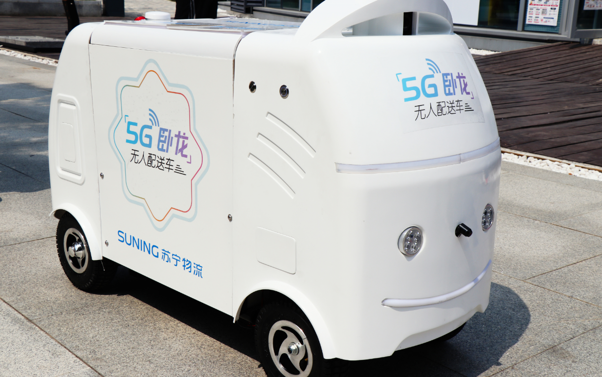 (圖:2019年8月17日,蘇寧物流5G“臥龍一號(hào)”無人配送車在南京實(shí)測(cè)成功 )