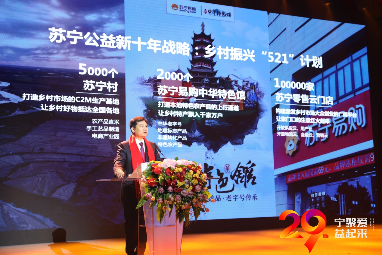 就在12月26日舉行的“蘇寧29周年公益慶生儀式暨新十年公益戰(zhàn)略發(fā)布會”上,蘇寧控股集團董事長張近東發(fā)布了蘇寧鄉(xiāng)村振興“521計劃”,中華特色館是其中重要部分,未來十年要達到2000個。同時,蘇寧村將會建設至5000個,蘇寧易購零售云門店則將要開到10萬家。張近東表示,“521”取自三個目標的首個數(shù)字,同時也寄托著著蘇寧幫扶鄉(xiāng)村、振興鄉(xiāng)村的深切感情。