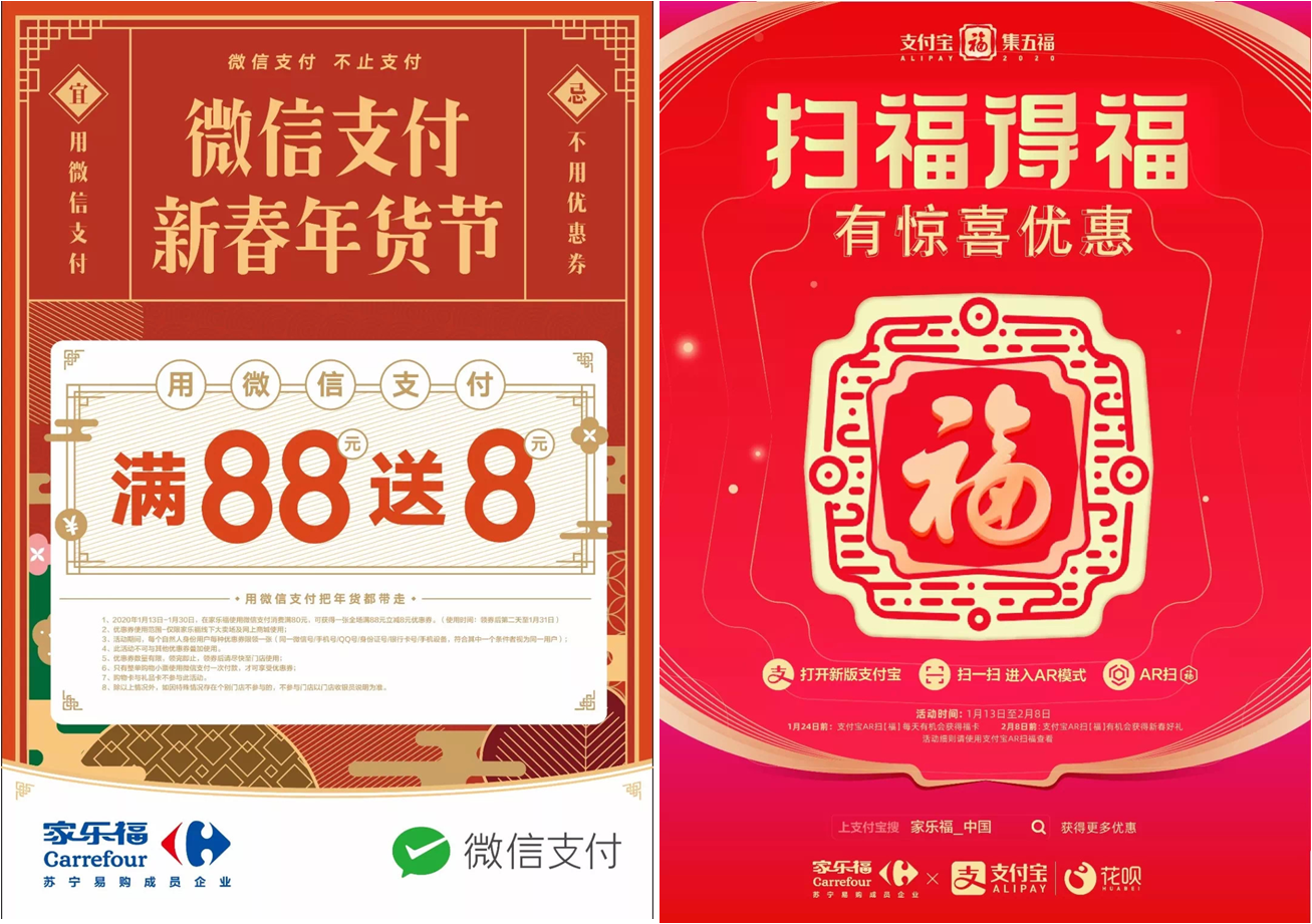 除此之外,各大支付平臺(tái)優(yōu)惠券亦開始發(fā)放,助力您的年貨采買。前方高能預(yù)警!1月13日至2月8日,顧客使用支付寶掃上圖“福”字以及參與集五?;顒?dòng),即有機(jī)會(huì)獲得家樂福全場(chǎng)滿200減10優(yōu)惠券。1月13日至1月30日,在家樂福使用微信支付消費(fèi)滿80元,可獲得一張全場(chǎng)滿88元立減8元優(yōu)惠券,
