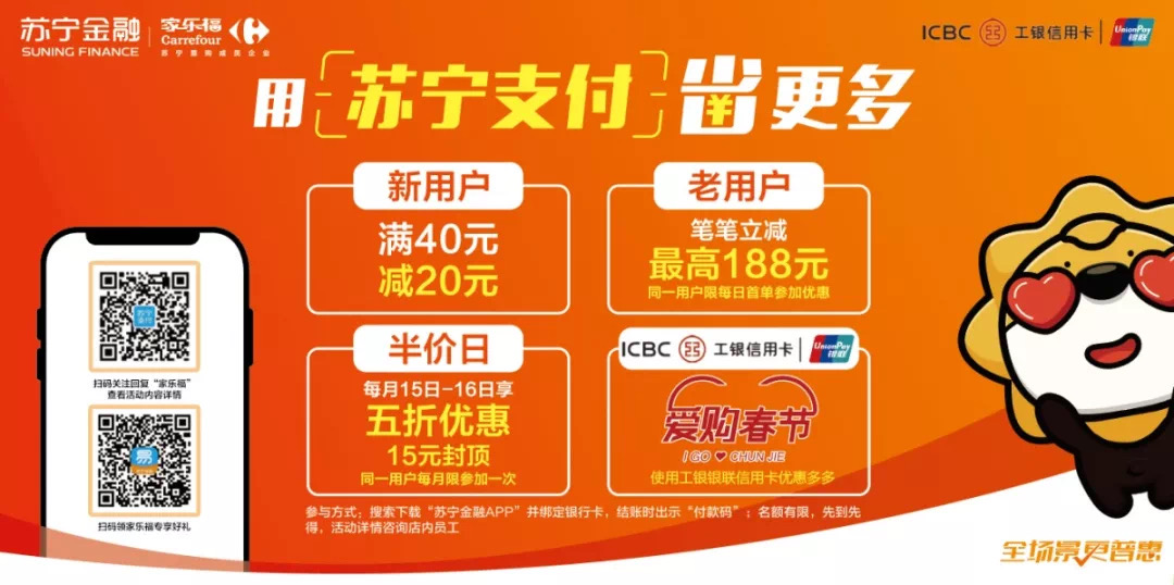 注意啦!使用蘇寧支付省更多!下載“蘇寧金融APP”并綁定銀行卡,在家樂福門店結(jié)賬時(shí)出示“付款碼”,新用戶可享滿40元減20元,老用戶筆筆立減,最高188元。每月15日至16日半價(jià)日,蘇寧支付用戶還可享五折優(yōu)惠,15元封頂。名額有限,先到先得。