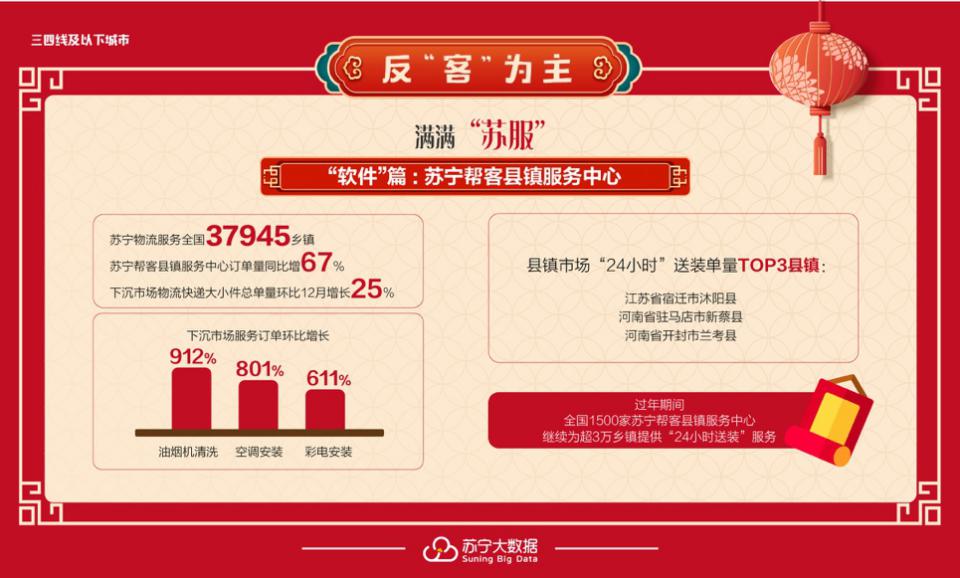 三四線城市則設(shè)立了蘇寧幫客縣鎮(zhèn)服務(wù)中心,數(shù)據(jù)顯示春節(jié)蘇寧幫客訂單量同比增長(zhǎng)67%,TOP3縣鎮(zhèn)為宿遷沭陽(yáng)縣、貴港桂平市、福州閩侯縣;最受歡迎服務(wù)為電視送裝一體服務(wù),訂單量同比增長(zhǎng)89%。在過(guò)年期間,全國(guó)1500家蘇寧幫客縣鎮(zhèn)服務(wù)中心,將繼續(xù)為超3萬(wàn)鄉(xiāng)鎮(zhèn)提供“24小時(shí)送裝”服務(wù)。