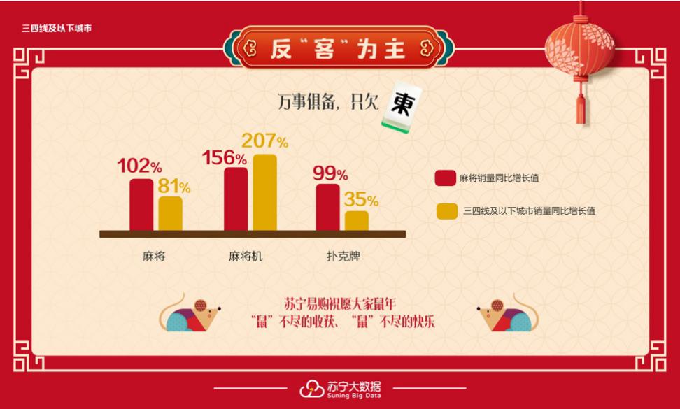 除此以外,春節(jié)作為“熬夜黨”們的主戰(zhàn)場(chǎng),零食和麻將一直是必備物料,三四線城市在這其中的消費(fèi)力也有了明顯增長(zhǎng)。蘇寧數(shù)據(jù)顯示,零食禮包銷量同比增長(zhǎng)137%,三線及以下城市銷量同比增長(zhǎng)158%;堅(jiān)果禮包銷量同比增長(zhǎng)142%,三線及以下城市銷量同比增長(zhǎng)279%;麻將銷量同比增長(zhǎng)102 %,三四線及以下城市銷量同比增長(zhǎng)81 %;麻將機(jī)銷量同比增長(zhǎng)156 %,三四線及以下城市銷量同比增長(zhǎng)達(dá)到了207 %。