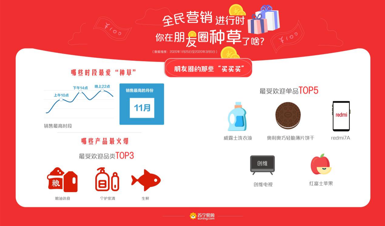 深圳新聞網(wǎng)2020年3月10日訊 線上買菜、線上看病、直播上課、遠(yuǎn)程健身……“宅經(jīng)濟(jì)”爆發(fā),使得社群私域流量積累的能量進(jìn)一步凸顯,全民營(yíng)銷成為新風(fēng)口。近日,蘇寧易購發(fā)布全民營(yíng)銷大數(shù)據(jù),2020年1月25日至3月5日,蘇寧推客買家數(shù)和賣家數(shù)分別突破千萬、百萬大關(guān),80后成為朋友圈買、賣“雙主力”,糧油休食、個(gè)護(hù)家清、生鮮等產(chǎn)品成為最受歡迎的消費(fèi)品類。