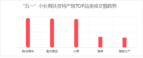 借助“五一”小長假及線上消費增長的勢頭,各地的線上扶貧特產(chǎn)館成交額同比增長了135%。各產(chǎn)地的糧油調(diào)味、禽肉蛋品、水果、蔬菜及海鮮水產(chǎn)等特產(chǎn)的成交額最高。