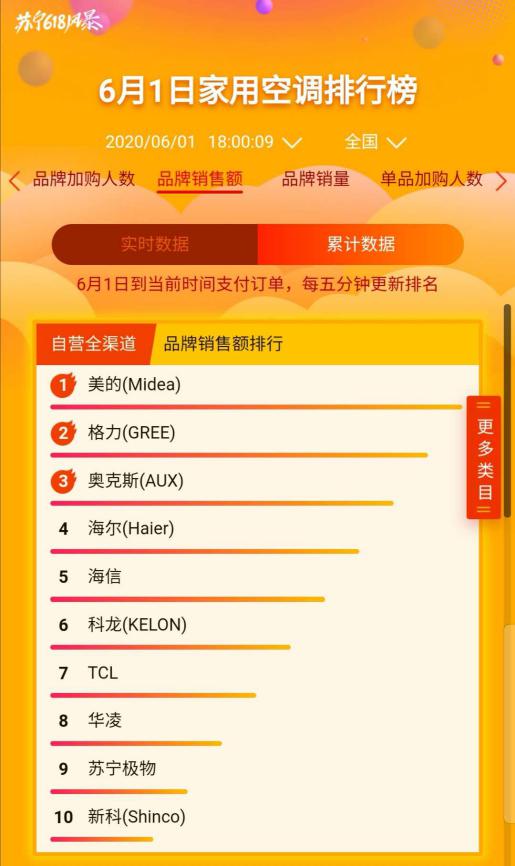 在蘇寧悟空榜,家電板塊火拼激烈,頭部品牌在蘇寧全渠道銷售暴增。截至6月1日18時,美的摘得家用空調(diào)及中央集成全渠道銷售額冠王,同時橫跨多品類品牌TOP榜,成為最大贏家。