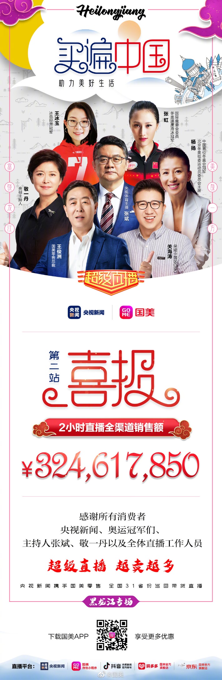見圳客戶端·深圳新聞網(wǎng)2020年8月4日訊 群星閃耀,再創(chuàng)佳績!7月31日晚20點(diǎn),“買遍中國·助力美好生活”全國31省份巡回帶貨直播黑龍江專場以3.25億的銷售額收官。出生于黑龍江的中央電視臺(tái)著名主持人敬一丹與黑龍江籍冬奧冠軍楊揚(yáng)、張虹、王冰玉共同組成“龍江四美”,與央視體育頻道主持人張斌一起,展現(xiàn)了黑龍江歷史文化、鄉(xiāng)土風(fēng)情,介紹了生態(tài)農(nóng)業(yè)發(fā)展,也推薦了諸多美食與好物,并為北京冬奧會(huì)助力加油!