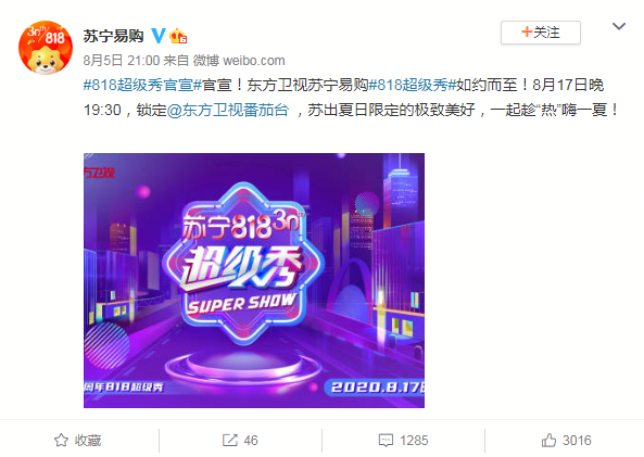 昨晚,蘇寧易購官方微博發(fā)布消息稱,8月17日19:30,蘇寧易購30周年818超級秀將登陸東方衛(wèi)視。