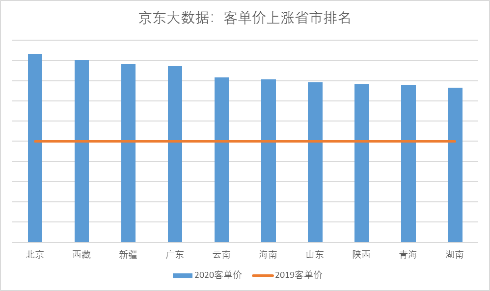 但是,消費者采購月餅時卻呈現(xiàn)出更積極的上升趨勢:據(jù)京東大數(shù)據(jù),今年京東平臺上不但用戶數(shù)大幅增加,其中相當大部分新用戶來自低線市場用戶,而且消費者相比去年更加追求品質,大品牌、高規(guī)格的月餅禮盒熱銷,因此月餅平均客單價比去年上漲了35%以上。下圖可見,除北京廣東等發(fā)達地區(qū)外,客單價上漲的主要動力來自于西北、西南和華中等地區(qū)。
