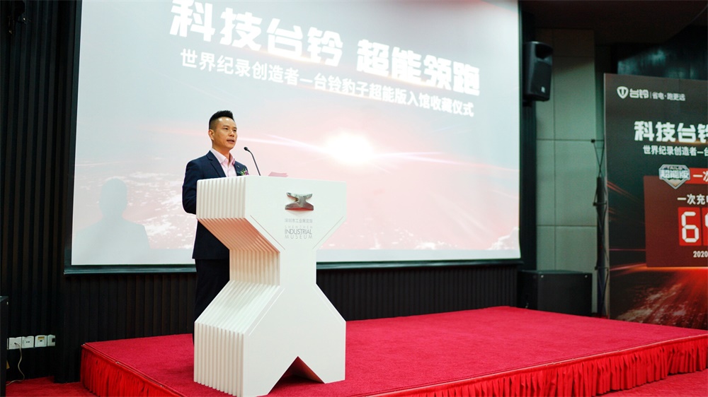 深圳市工業(yè)展覽館副館長潘文峰,深圳電動車產(chǎn)業(yè)促進委員會執(zhí)行會長楊華,臺鈴集團董事長孫木鉗、臺鈴集團總裁助理兼公關(guān)總監(jiān)胡東文等嘉賓齊聚深圳市工業(yè)展覽館,參加了以“科技臺鈴超能領(lǐng)跑”為主題的世界紀錄創(chuàng)造者——臺鈴豹子超能版入館收藏儀式,共同見證了這一榮光時刻。