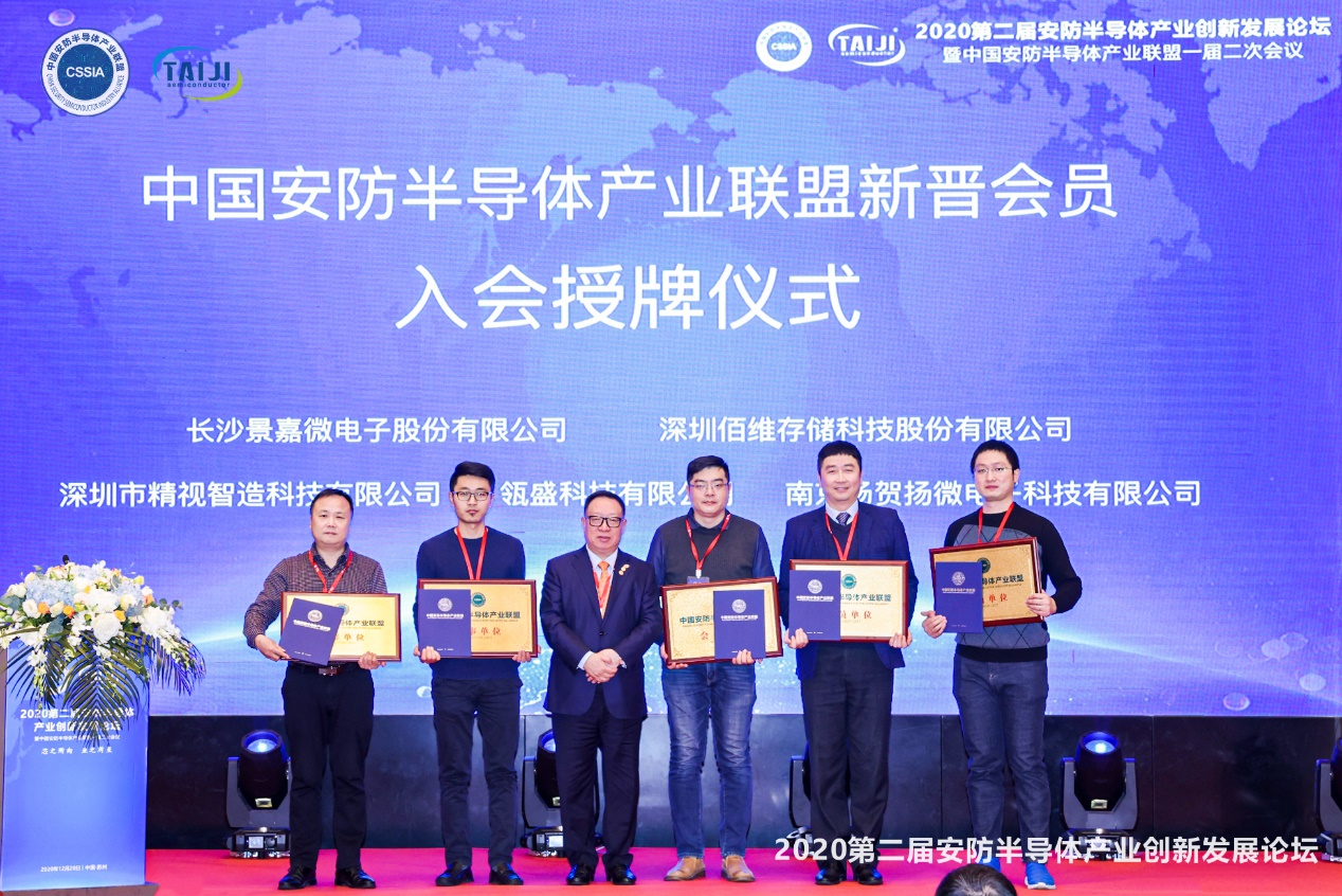 會(huì)議尾聲,還舉行了中國安防半導(dǎo)體產(chǎn)業(yè)聯(lián)盟新晉會(huì)員單位入會(huì)授牌儀式。深圳佰維存儲科技股份有限公司、長沙景嘉微電子股份有限公司榮膺聯(lián)盟理事單位,瓴盛科技有限公司、深圳市精視智造科技有限公司,南京揚(yáng)賀揚(yáng)微電子科技有限公司榮膺聯(lián)盟會(huì)員單位。中國安防半導(dǎo)體產(chǎn)業(yè)聯(lián)盟主席楊金才為以上單位進(jìn)行授牌。