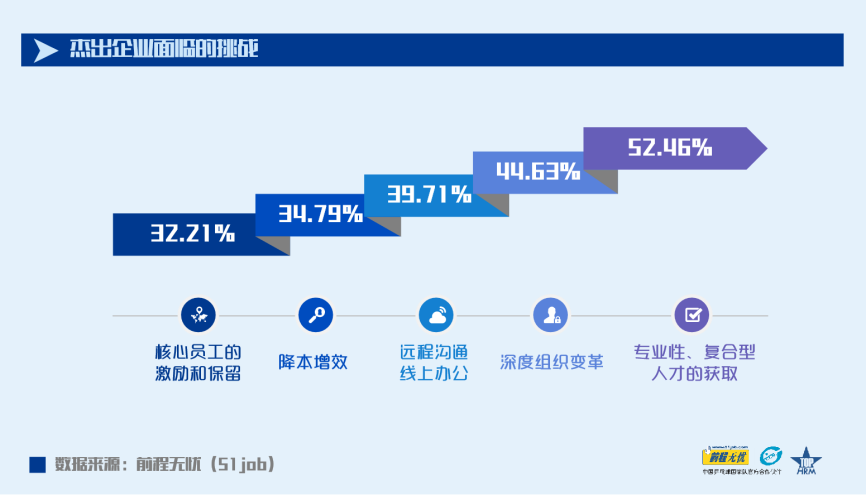 2020年杰出企業(yè)招聘員工總數(shù)較2019年增長(zhǎng)了4.21%;55.48%的企業(yè)預(yù)計(jì)人均招聘成本呈增長(zhǎng)趨勢(shì),在此前提下,依然有56.04%的企業(yè)預(yù)計(jì)會(huì)在2021年擴(kuò)大招聘來獲取人才優(yōu)勢(shì)。894家獲獎(jiǎng)企業(yè)中,有469家將“為籌備未來招募新團(tuán)隊(duì),加大專業(yè)性人才和復(fù)合型人才的獲取“列為本年度企業(yè)人力資源管理所面臨的最大的挑戰(zhàn)。