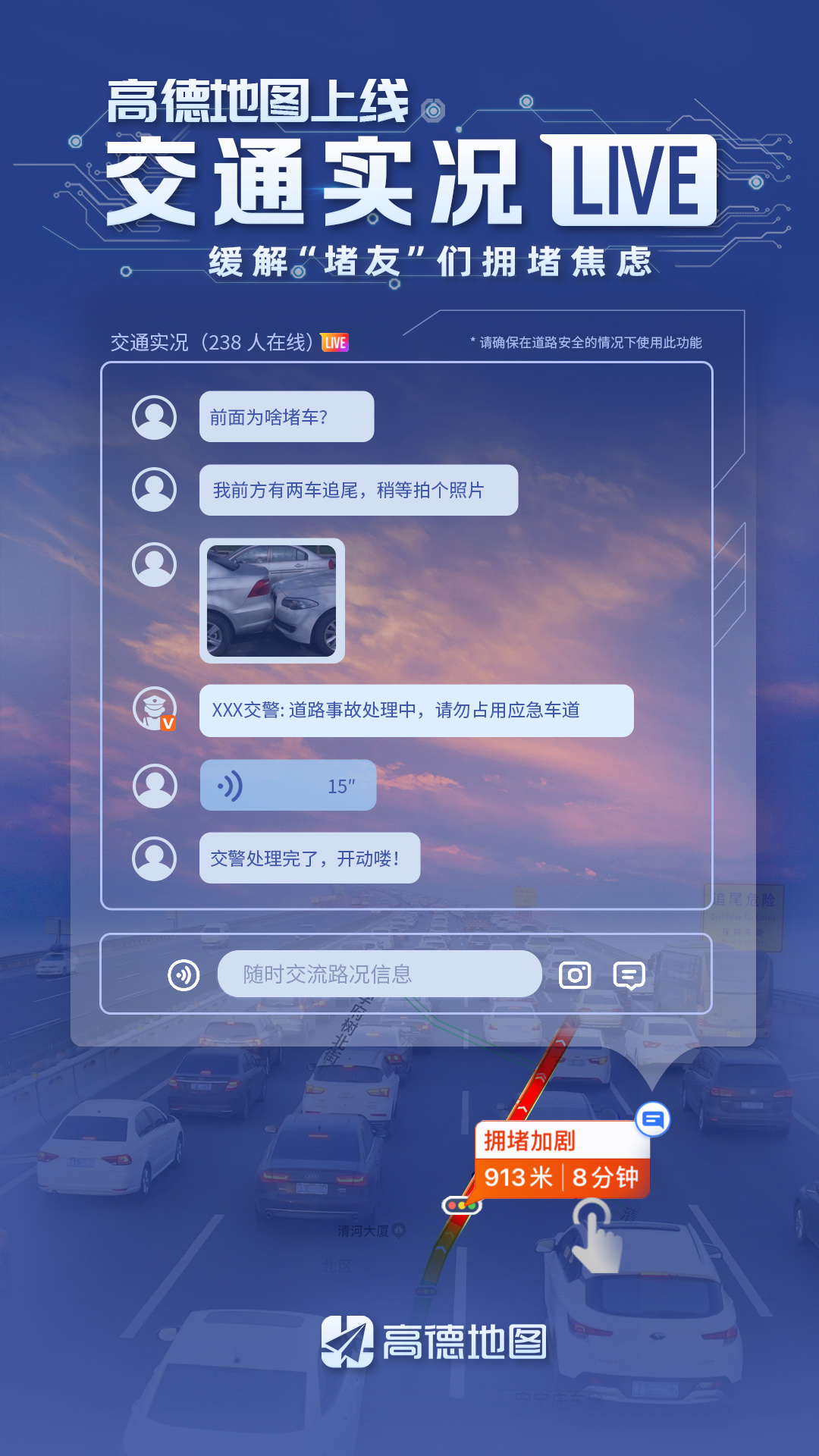 通過(guò)這個(gè)平臺(tái),各地交管部門可及時(shí)發(fā)布擁堵事件的權(quán)威信息,如擁堵原因、派警情況、預(yù)計(jì)疏通用時(shí)及現(xiàn)場(chǎng)圖片等。當(dāng)用戶進(jìn)入嚴(yán)重?fù)矶侣范螘r(shí),通過(guò)點(diǎn)擊提醒氣泡即可進(jìn)入該界面,實(shí)時(shí)了解擁堵信息。在車輛因堵車無(wú)法行進(jìn)時(shí),“堵友”們還可以互通有無(wú),通過(guò)文字、語(yǔ)音、圖片等多種方式,為后方司機(jī)分享第一手信息。而當(dāng)擁堵疏散時(shí),“交通實(shí)況”功能也將自動(dòng)關(guān)閉。