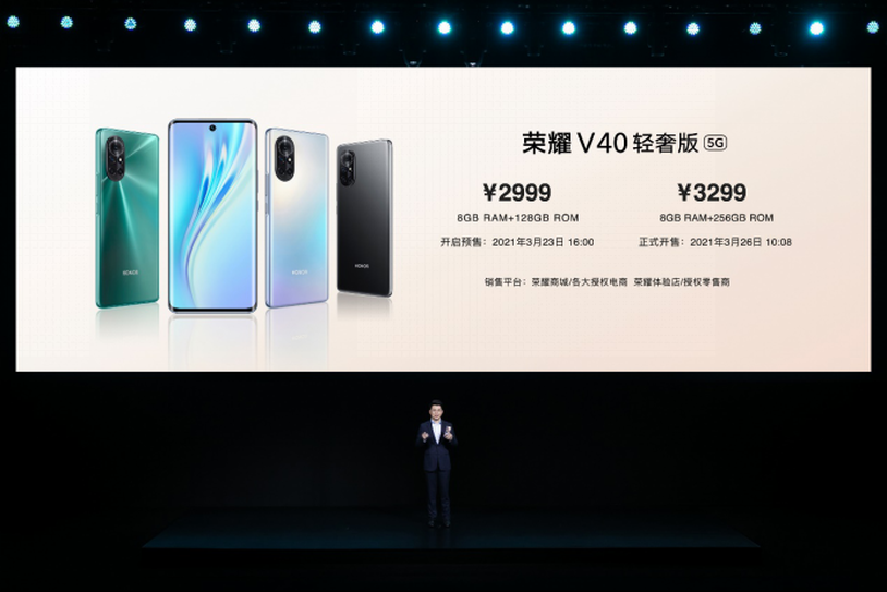 榮耀V40輕奢版擁有幻夜黑、藍(lán)水翡翠和鈦空銀三種配色,提供8GB+128GB、8GB+256GB兩個(gè)內(nèi)存版本,售價(jià)分別為2999元和3299元。3月26日10:08在線上線下全平臺(tái)開售,用戶可通過(guò)榮耀商城及各大授權(quán)電商平臺(tái)或前往榮耀線下體驗(yàn)店、榮耀授權(quán)零售門店進(jìn)行購(gòu)買。
