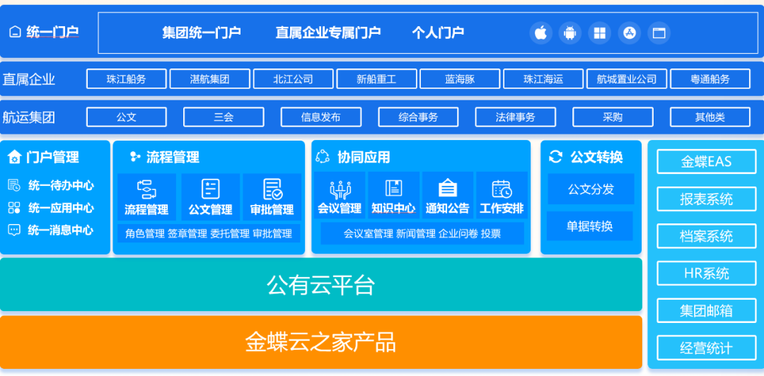 作為大型綜合性國企,廣東航運集團現(xiàn)有直屬企業(yè)8家,擁有全資、控股、參股及代理水路客運港口13家,經(jīng)營和管理96艘粵港澳高速客船。伴隨經(jīng)營規(guī)模的發(fā)展、技術(shù)迭代、應(yīng)用場景深入,其信息化需要一個可以覆蓋集團協(xié)同應(yīng)用場景的綜合辦公平臺,而集團原有的OA已經(jīng)無法滿足航運的持續(xù)發(fā)展需要。