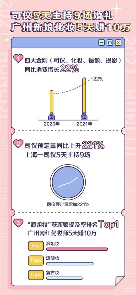“快要忙瘋了,五一5天辦了150多場婚禮,第一天就有60場,去年這時候婚禮只有個位數(shù),今年我們員工都加班加點連夜趕工搭建場地。”婚禮紀商家Sunny喜鋪婚禮副總趙佳佳在接受采訪的時候表示,不僅商家忙,新人也非常忙,Z世代的新人都習慣于通過線上咨詢、直播下單等互聯(lián)網(wǎng)形式進行婚禮消費,省去了線下奔波的時間。