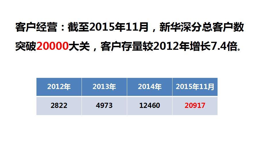 客戶(hù)經(jīng)營(yíng):截至2015年11月,新華深分總客戶(hù)數(shù)突破20000大關(guān),較2012年增長(zhǎng)近7.4倍。