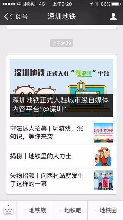 “深圳地鐵”是深圳軌道(地鐵)運(yùn)營唯一的官方微信,每日發(fā)布最有時(shí)效的地鐵運(yùn)營相關(guān)資訊及各類地鐵相關(guān)知識(shí),聚焦市民最關(guān)心的“暢通出行”。在“深圳地鐵”可以看到運(yùn)營資訊、地鐵知識(shí)科普、地鐵活動(dòng)等各類與地鐵相關(guān)的信息?!吧钲诘罔F”除了每天定時(shí)發(fā)布的各類地鐵資訊外,還可以讓市民在線對地鐵運(yùn)營狀態(tài)及服務(wù)、設(shè)施設(shè)備等進(jìn)行投訴或建議,同時(shí),也對在地鐵內(nèi)丟失物品的乘客提供了一個(gè)“失物招領(lǐng)”的查詢平臺(tái)。截至目前,粉絲數(shù)近50萬。