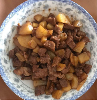 我們準(zhǔn)備好食材:梅頭肉、土豆、生抽和老抽、姜、少量白砂糖和油。媽媽把梅頭肉在水里煮了一下。這個(gè)時(shí)候,我也沒閑著,我拿出幾個(gè)土豆,洗好,再用刨子小心翼翼地把皮削干凈。我和媽媽一起把梅頭肉和土豆切塊,把姜切細(xì),就準(zhǔn)備下鍋了。媽媽先倒一點(diǎn)油到鍋里,鍋熱后把姜放進(jìn)去。接下來是切好的梅頭肉,將肉燒的泛黃后倒入土豆,然后是生抽和老抽各一小勺,還要放入少量的白砂糖,最后用水剛好沒過食材。先大火后中火再轉(zhuǎn)小火燜大約三十分鐘,收汁,出鍋!
