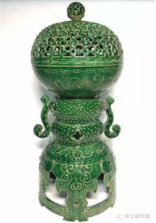 香薰在古代是頗為流行的室內(nèi)陳設(shè)用器,形制多樣,材質(zhì)不一。漢唐時(shí)期出土的香薰眾多,如有名的漢代博山爐,唐代香薰球等。兩宋時(shí)期,實(shí)行文人治國,香具更是盛行,影響所及,同時(shí)并存的遼、金兩朝也頗為風(fēng)行。當(dāng)然,香具中也區(qū)分宅舍用及寺廟用、宮殿用等。其中寺廟及宮殿用品多為成對(duì)擺放,講究對(duì)稱之美,顯得莊重大方。而宅舍之用更為推崇雅致,趣味。下面介紹的這件綠釉香薰應(yīng)為遼金時(shí)期的寺廟用品。 香薰高31.5cm、直徑14.5cm,整體呈豆式。豆是先秦禮器,用以在祭祀、宴饗中盛放肉食。在家廟祭祀中,豆是不可或缺的禮儀用具,早期豆用竹編成,后用青銅鑄造,因此在禮書中稱“籩豆”。此對(duì)香薰延續(xù)了青銅豆的大體形制,上作球形,香盤半圓,蓋為鏤空半圓,扣合后渾然如一。香盤可拆卸,安插于支座上。座上部為雙扁圓狀疊壓,兩側(cè)裝飾螭龍耳;下部呈鏤空裙擺式,承以托泥,穩(wěn)重大方。通體施綠釉,釉面潤澤,純凈自然。器身點(diǎn)綴穿花龍紋,如意紋,加之裙擺上的龕形開光,推測(cè)為當(dāng)時(shí)高等級(jí)的寺廟的佛前薰香供器。 欣賞更多藏品,歡迎瀏覽【黃志博物館】網(wǎng)站。 我們會(huì)介紹更多的收藏知識(shí)、推薦更多優(yōu)質(zhì)優(yōu)價(jià)的藏品供您了解和選擇,也歡迎您把這些分享給朋友們,讓大家一起來了解歷史文化、體會(huì)收藏的快樂!