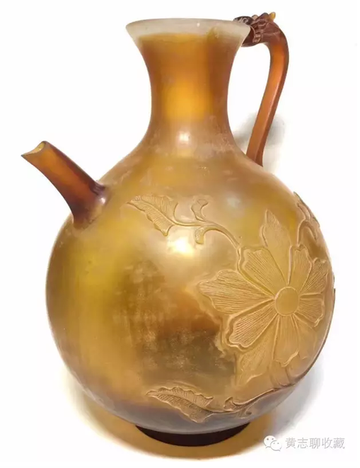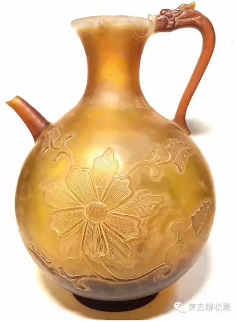 這件執(zhí)壺為琉璃材質(zhì),高20cm、腹徑14.5cm,色澤黃褐,半透明,晶瑩潤澤,光澤柔和。小口,束頸,腹部圓鼓,餅足;前有直流,后為龍柄。整體形制穩(wěn)重大方,圓潤飽滿,具有典型的唐代特征。壺身兩面刻有菊紋,線條流暢自然,勁健有力。整體透入出唐人的灑脫自信。這類唐代的琉璃作品存世極少,目前為數(shù)不多的一些作品大多出自窖藏、地宮及貴族墓葬,屬于珍稀文物。此件執(zhí)壺保存完整,尤為難得。