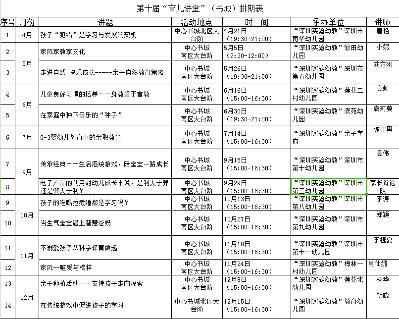第十屆“育兒講堂”(書城)排期表