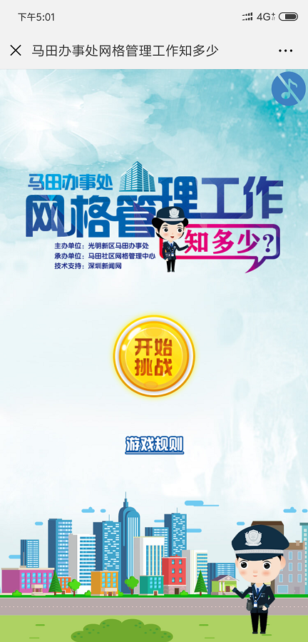 隨著當前光明新區(qū)經(jīng)濟和社會的飛速發(fā)展,網(wǎng)格巡查管理工作環(huán)境日趨復(fù)雜。為此,馬田辦事處以社區(qū)網(wǎng)格化為抓手,積極帶領(lǐng)業(yè)主、樓長、住戶主動參與到樓棟的管理和社區(qū)的建設(shè),使他們從小“家”邁向大“家”,家家參與、人人行動,讓安全文明新風(fēng)形成常態(tài),營造生機勃勃、欣欣向榮的社會氛圍,在馬田轄區(qū)打造共建共治共享社會治理格局?!榜R田辦事處網(wǎng)格管理工作知多少”線上有獎競答活動,由光明新區(qū)馬田辦事處主辦,馬田社區(qū)網(wǎng)格管理中心承辦。此次答題活動自8月15日9點啟動,截止至8月19日23點59分,為期5天。答題分為“我是網(wǎng)格員”入口、“我是樓長”入口和“阿拉地球人”三個入口。通過樓長入口進入的用戶,需輸入馬田轄區(qū)樓長身份證或港澳通行證號方可答題,網(wǎng)格員入口則需輸入馬田轄區(qū)網(wǎng)格員有效證件號碼進入對應(yīng)的答題頁面。在每次答題時,答題系統(tǒng)將隨機抽取10道題,用戶須在120秒的時間內(nèi)完成,答對8題以上即視為闖關(guān)成功,可獲得一次抽獎機會,有機會獲得100元、50元、10元、5元、2元不等的微信紅包。