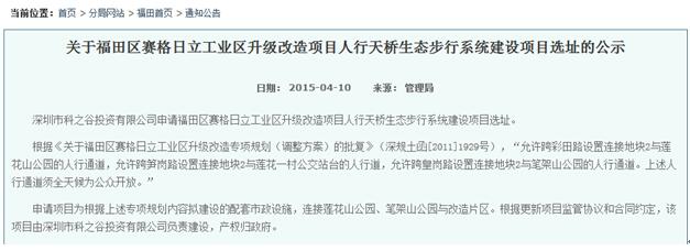 而據(jù)資料記載,市規(guī)土委曾經(jīng)在2015年4月10日,在福田管理局官網(wǎng)上發(fā)布了《關(guān)于福田區(qū)賽格日立工業(yè)區(qū)升級(jí)改造項(xiàng)目人行天橋生態(tài)步行系統(tǒng)建設(shè)項(xiàng)目選址的公示》,其中明確提到“根據(jù)《關(guān)于福田區(qū)賽格日立工業(yè)區(qū)升級(jí)改造專(zhuān)項(xiàng)規(guī)劃(調(diào)整方案)的批復(fù)》(深規(guī)土函[2011]1929號(hào)),‘允許跨彩田路設(shè)置連接地塊2與蓮花山公園的人行通道,允許跨筍崗路設(shè)置連接地塊2與蓮花一村公交站臺(tái)的人行道,允許跨皇崗路設(shè)置連接地塊2與筆架山公園的人行通道。上述人行通道須全天候?yàn)楣婇_(kāi)放’?!?/p>