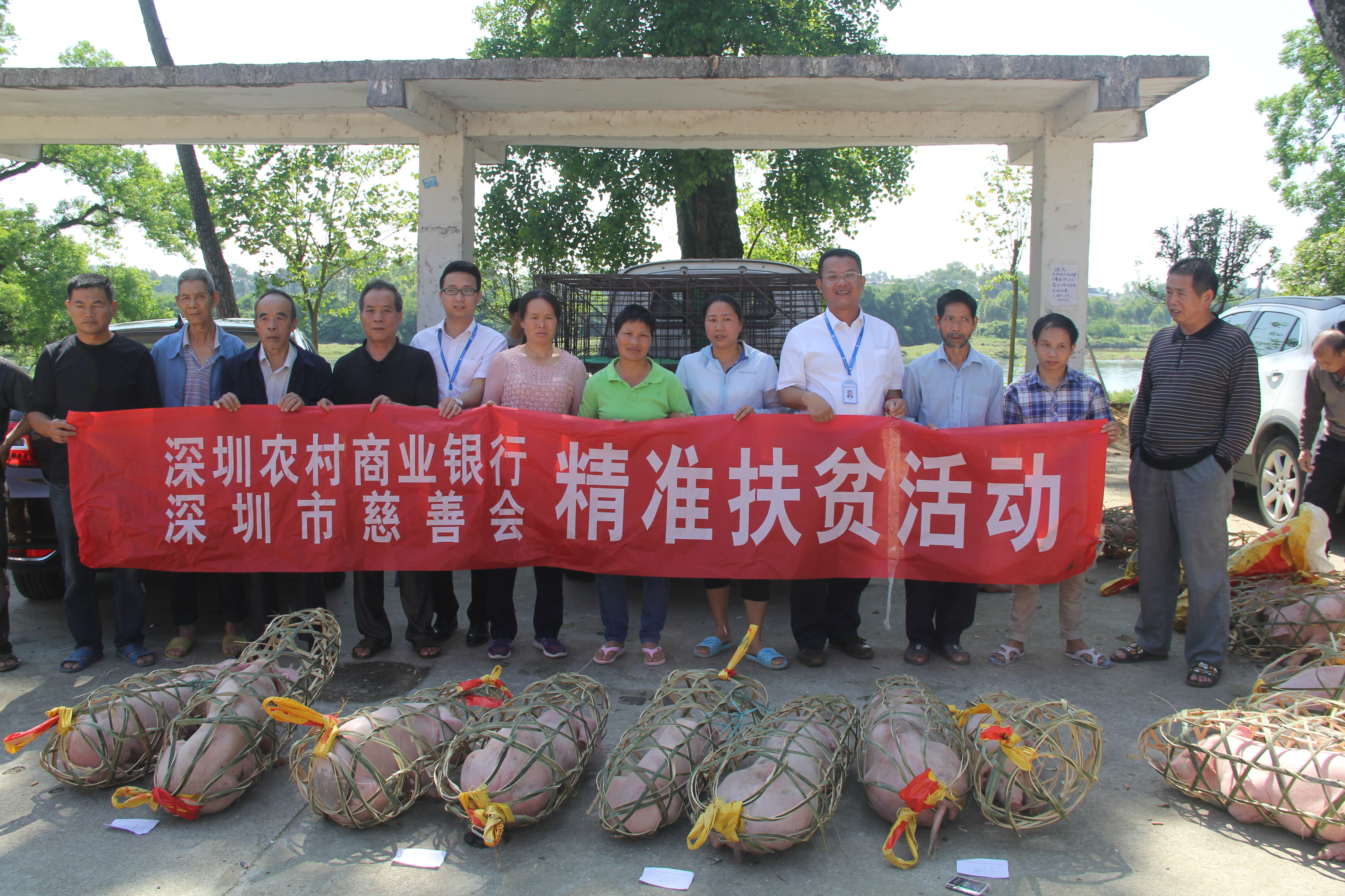 2017年,深圳農(nóng)商行的廣西6家機(jī)構(gòu)開展了“深桂心連心”精準(zhǔn)扶貧活動(dòng),向所在地貧困戶免費(fèi)發(fā)放農(nóng)業(yè)生產(chǎn)資料,通過采購(gòu)等值的農(nóng)資(如雞、鴨、豬崽、農(nóng)作物種子與樹苗等)按戶發(fā)放給扶貧對(duì)象,待雞、鴨、豬崽和農(nóng)作物可出售時(shí)由廣西各機(jī)構(gòu)介紹銷售或負(fù)責(zé)回購(gòu),確保扶貧對(duì)象既能脫貧,又能提高致富能力。深桂心連心精準(zhǔn)扶貧活動(dòng),共資助了299戶貧困戶,扶貧總投入為292879元。通過扶貧活動(dòng),帶動(dòng)更多的貧困戶依靠辛勤勞動(dòng),脫貧致富。
