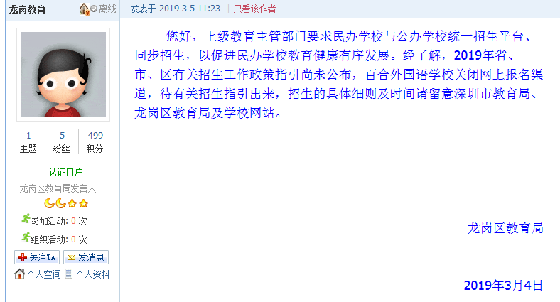 3月5日11時23分,龍崗區(qū)教育局官方賬號發(fā)布回應網(wǎng)帖,回應稱“上級教育主管部門要求民辦學校與公辦學校統(tǒng)一招生平臺、同步招生,以促進民辦學校教育健康有序發(fā)展。”“2019年省、市、區(qū)有關招生工作政策指引尚未公布,百合外國語學校關閉網(wǎng)上報名渠道,待有關招生指引出來,招生的具體細則及時間請留意深圳市教育局、龍崗區(qū)教育局及學校網(wǎng)站。”