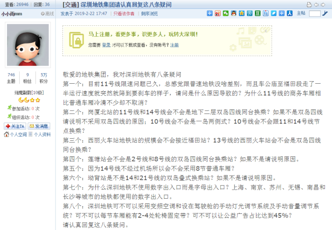 2月22日,有市民在深圳論壇發(fā)帖《敬愛的地鐵集團,我對深圳地鐵有八條疑問》,對深圳地鐵提出一系列專業(yè)且詳細的問題:“11號線限速問題由來已久”“11號線商務車廂比普通車廂冷清不少卻不取消”,對新建地鐵線路的換乘方式、14號線采用普通車廂還是商務車廂、西麗站的規(guī)模等建設方案提出疑問,并質疑地鐵站出入口使用字母標識而不是數(shù)字標識是否合理。帖文中也提出了“采用變頻空調”“手動燈光調節(jié)系統(tǒng)及手動音量調節(jié)系統(tǒng)”“每節(jié)車廂能有2-4處輪椅固定帶”等建議,并希望“車站內公益廣告占比要達到45%”。