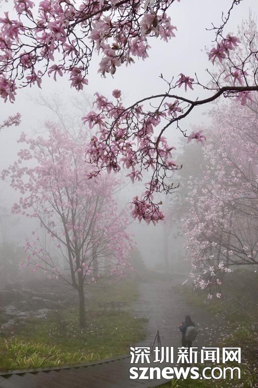雨霧濛濛之中觀賞盛開的辛夷花,宛若置身仙境......李仁奇 攝