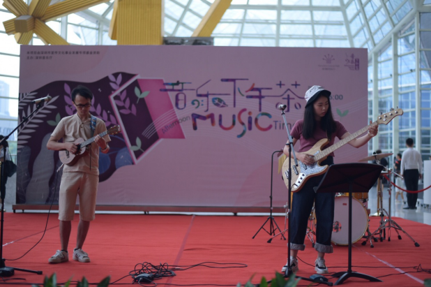 畢業(yè)于深圳大學(xué)金鐘音樂學(xué)院的主唱周鈺城帶來兩首尤克里里樂隊(duì)歌曲, Jason Mraz 的經(jīng)典曲目《 I’ m Yours 》和英國當(dāng)紅歌星 E d sheeran 的 《 Thinking out Loud 》,周鈺城富有磁性的嗓音,在深圳夏威夷小吉他協(xié)會理事謝佳宜的尤克里里琴聲以及同樣畢業(yè)于深圳大學(xué)金鐘音樂學(xué)院的鼓手黃曉輝的鼓聲伴奏中,美妙的融合在一起。