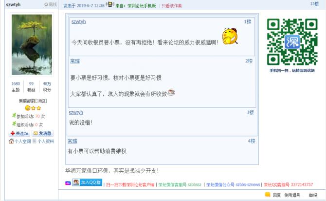 記者從問政平臺得知,5月底以來,還有市民發(fā)帖反映,除華潤萬家外,科技園萬象天地華潤Ole、僑香路沃爾瑪?shù)瘸幸泊嬖诓惶峁┘堎|(zhì)購物小票的情況。目前,市民仍然普遍認同超市應(yīng)主動提供紙質(zhì)購物小票,避免顧客被價格欺詐。有市民表示:“遇到最多的是優(yōu)惠打折,實際還是原價買單,這時,手中有小票一目了然,不花冤枉錢?!边€有市民質(zhì)疑,“奸商,動不動就打著環(huán)保這些高大上的理由作借口”。同時,也有市民體驗過微信小票后表示,“沃爾瑪手機掃碼付款是沒有紙票,購物小票藏在微信公眾號里,退換貨就在那里面進行。這就是科技發(fā)達帶來的豐碩成果,挺好的?!苯刂劣浾甙l(fā)稿時,市民關(guān)于科技園萬象天地華潤Ole、僑香路沃爾瑪?shù)瘸胁惶峁┵徫镄∑钡奶倪€沒有得到相關(guān)部門回應(yīng)。