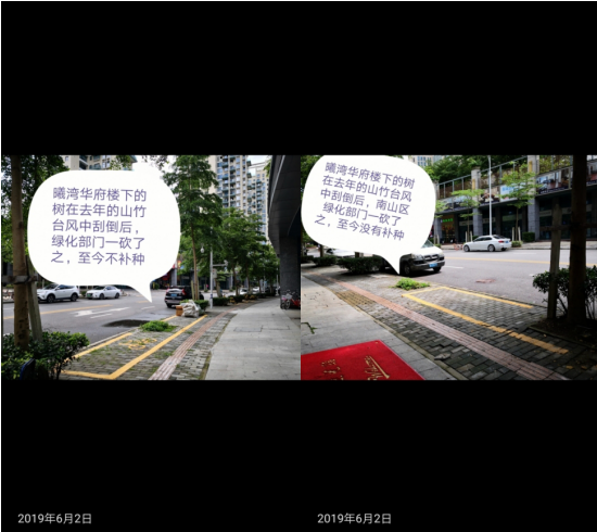 “南山區(qū)城管局當(dāng)時(shí)回應(yīng)道:‘因臺(tái)風(fēng)砍倒的樹(shù)木將會(huì)統(tǒng)一采購(gòu),盡快予以補(bǔ)種;有問(wèn)題的路牌將于七月底前更換。會(huì)盡快聯(lián)系南山稅務(wù)部門(mén),修復(fù)有問(wèn)題的井蓋’”,該市民卻對(duì)管理部門(mén)的工作效率提出質(zhì)疑:“然而現(xiàn)在距離投訴已經(jīng)兩個(gè)月了,問(wèn)題依然存在。工作效率如此之低?”