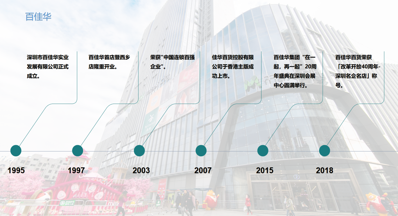 深圳市百佳華百貨有限公司是一家以中國(guó)商務(wù)部批準(zhǔn)成立的外商投資企業(yè),注冊(cè)資金22040萬(wàn)元。目前,公司在深圳、佛山、南寧等地開(kāi)設(shè)有十多家連鎖購(gòu)物商場(chǎng),經(jīng)營(yíng)面積約30萬(wàn)平方米,年銷售額超20億元。于2007年5月21日在香港聯(lián)交所主板成功上市,成為廣東省為數(shù)不多的實(shí)現(xiàn)整體上市的零售企業(yè)。