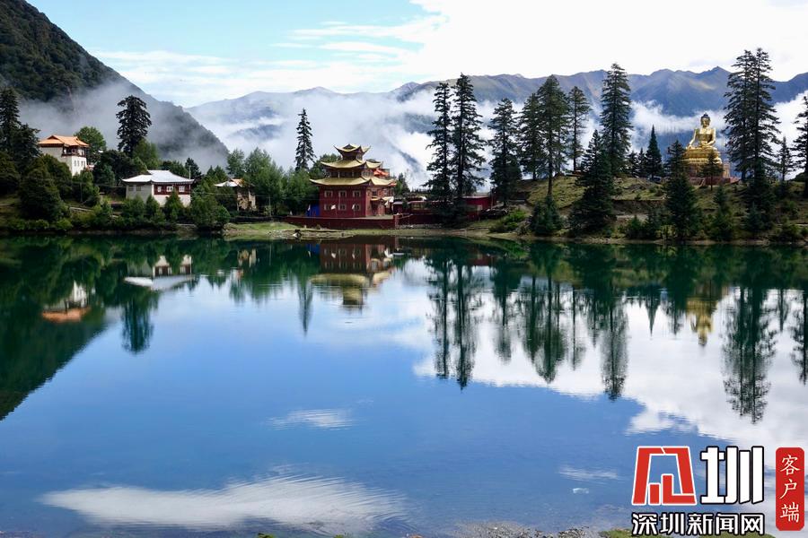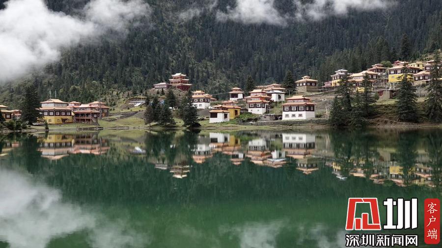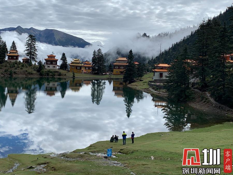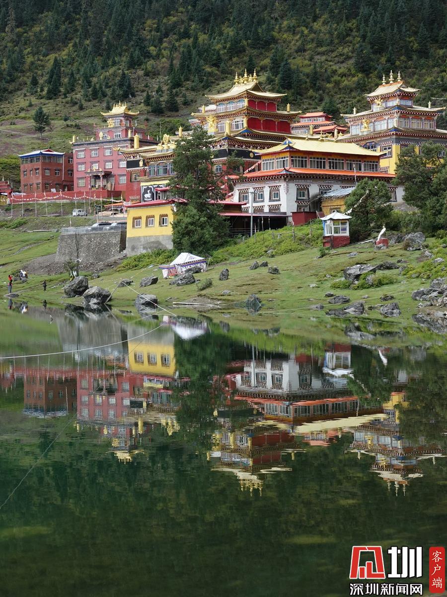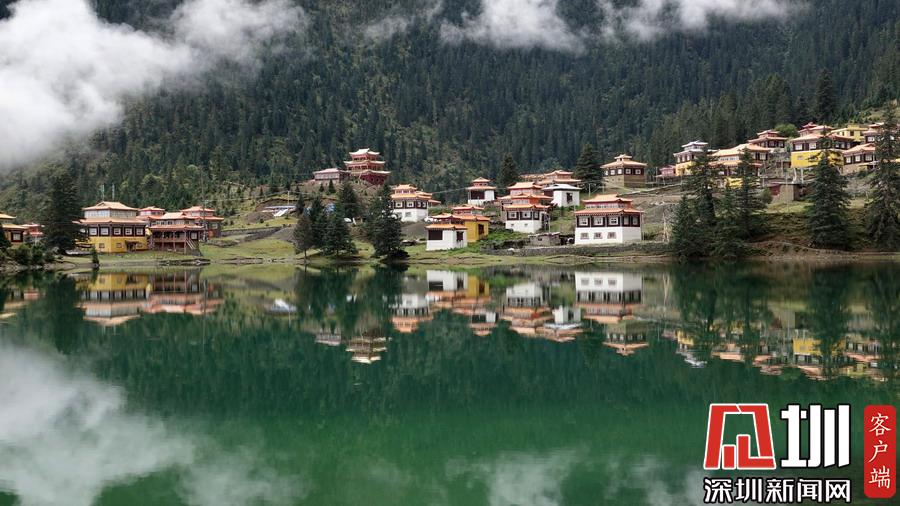 湖的四周是森林和由措卡寺寺僧主持修建的藏傳佛教各色建筑,它們時而云遮霧障,時而與藍(lán)天白云一起倒映在湖中。李仁奇攝