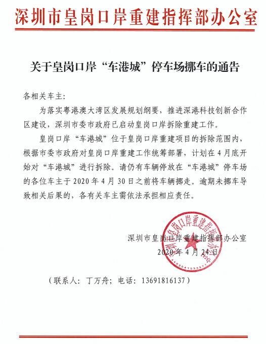 據(jù)了解,皇崗口岸“車港城”位于皇崗口岸重建項(xiàng)目的拆除范圍內(nèi),根據(jù)市委市政府對皇崗口岸重建工作統(tǒng)籌部署,計(jì)劃在4月底開始對“車港城”進(jìn)行拆除。請仍有車輛停放在“車港城”停車場的各位車主于2020年4月30日之前將車輛挪走,逾期未挪車導(dǎo)致相關(guān)后果的,各有關(guān)車主需依法承擔(dān)相應(yīng)責(zé)任。