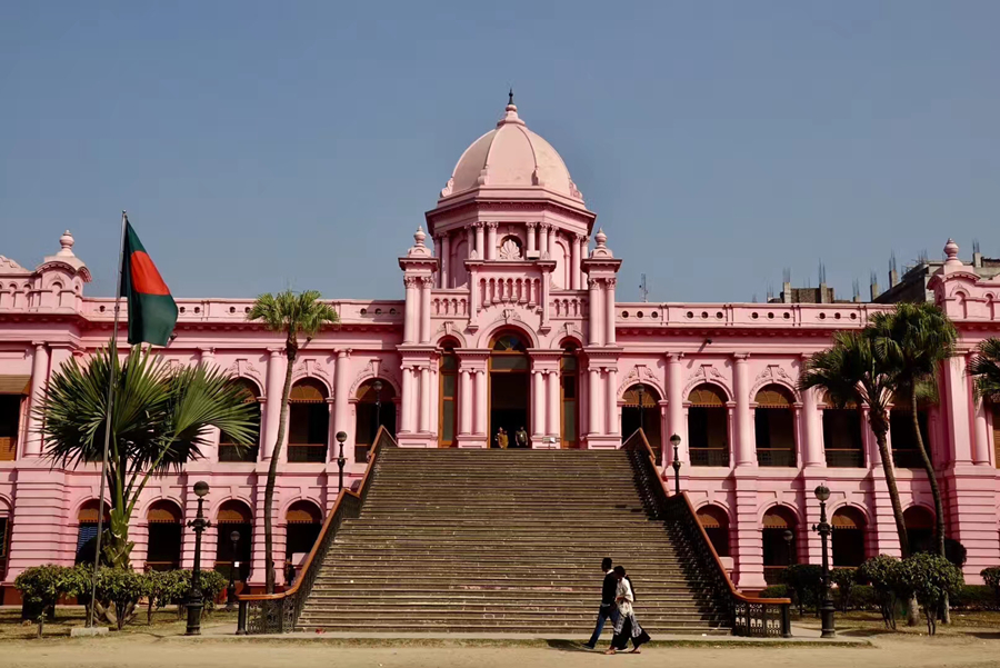 距孟加拉恒河渡口不遠(yuǎn)的地方有一座粉紅色宮殿式的豪華建筑。那是1872年一位名叫阿赫桑曼濟(jì)勒的地主在法國人留下的倉房基礎(chǔ)上改建的私邸,后來曾在一次龍卷風(fēng)襲擊時(shí)受創(chuàng)。李仁奇 攝