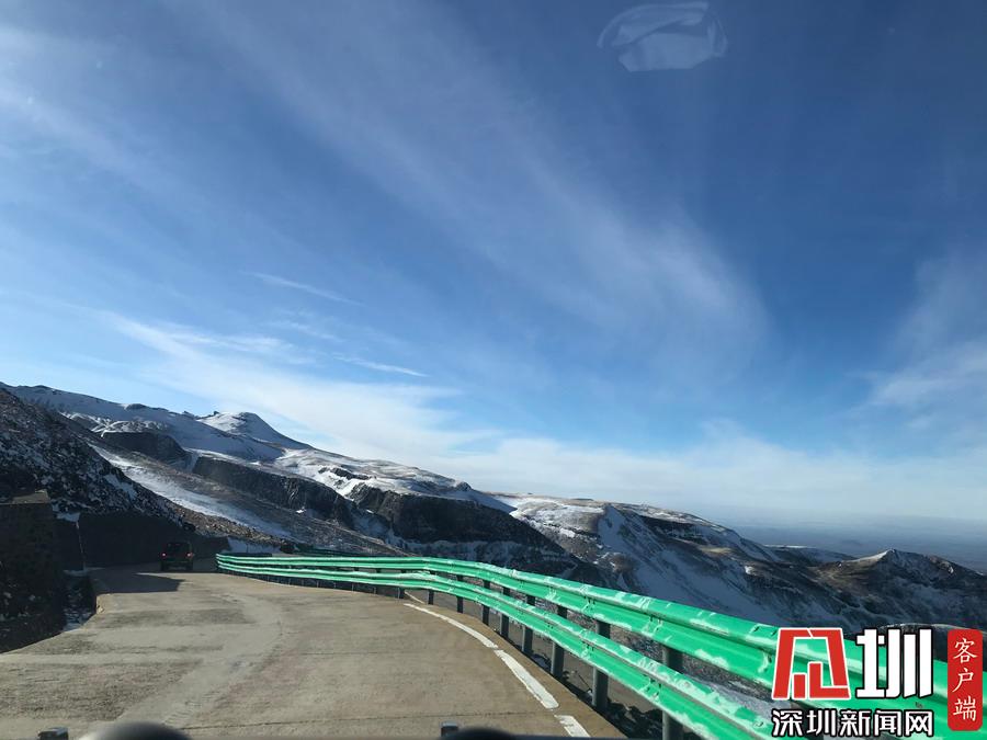 山上積雪覆蓋,與天邊的景色相互交映成一幅美麗的風(fēng)景畫(huà)。