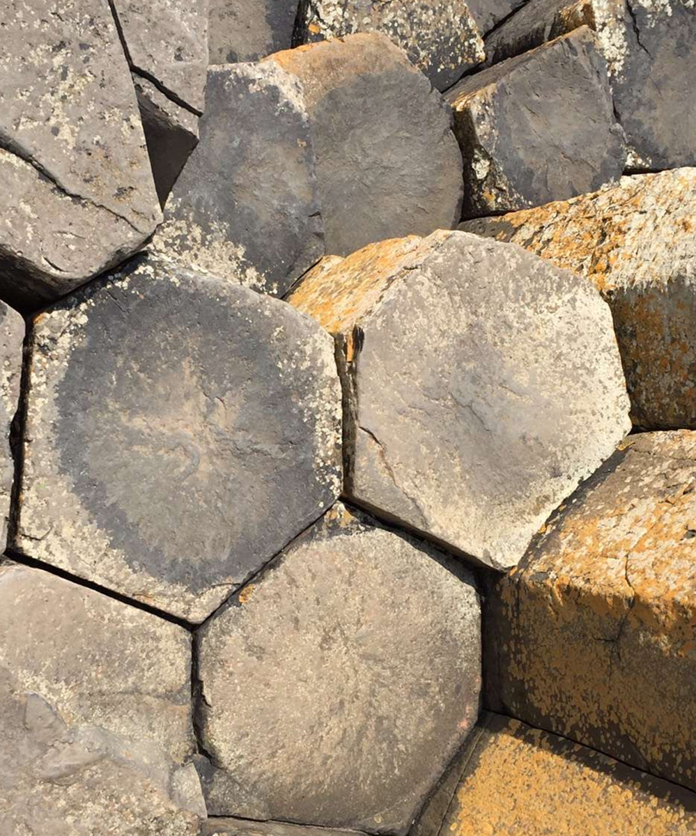 約五千萬(wàn)年前,在今天蘇格蘭西部?jī)?nèi)赫布里底群島一線至北愛爾蘭東部火山非常活躍,一股股玄武巖巖熔流從裂隙的地殼中涌出,隨著灼熱的熔巖冷卻收縮,結(jié)晶的時(shí)候,開始爆裂呈規(guī)則的六邊形形態(tài)。李仁奇 攝
