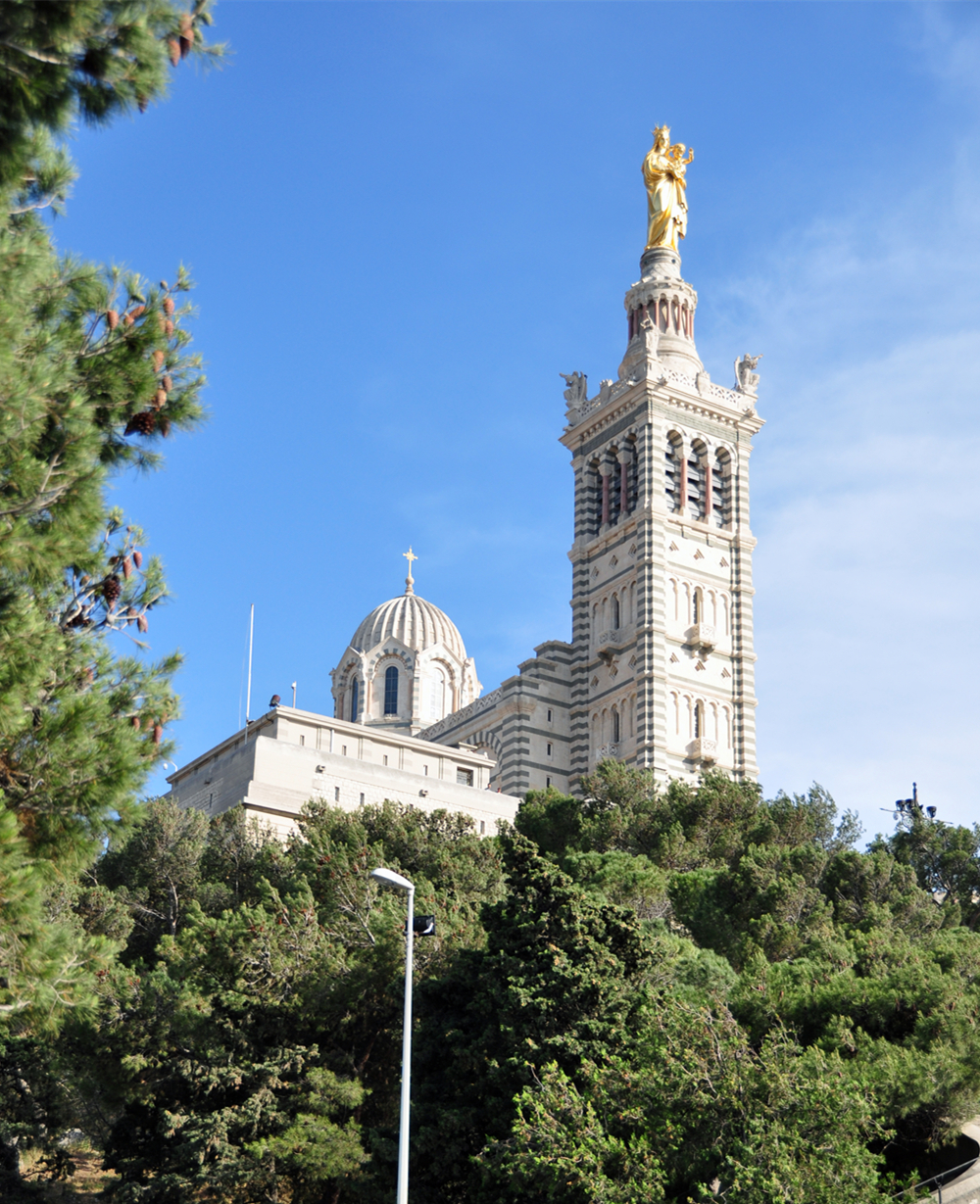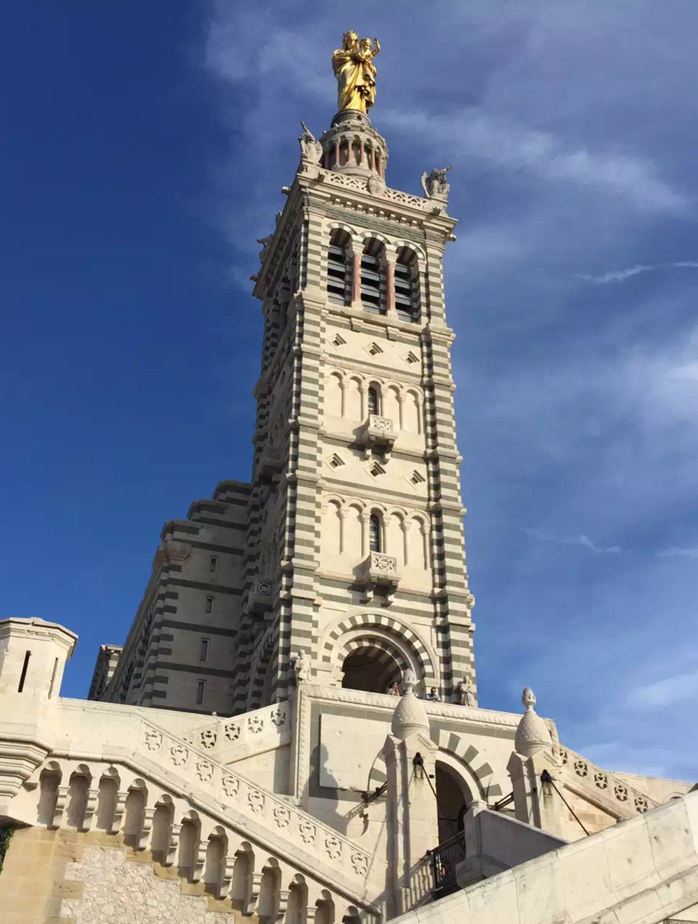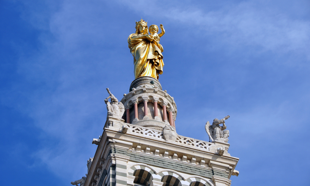 教堂主體建筑上方有一座金色的高達(dá)9.7米的鍍金圣母像,據(jù)說,幾乎在馬賽的任何角度都可看到這尊閃閃發(fā)光的圣母像,教堂也因此成為馬賽的標(biāo)志。李仁奇 攝
